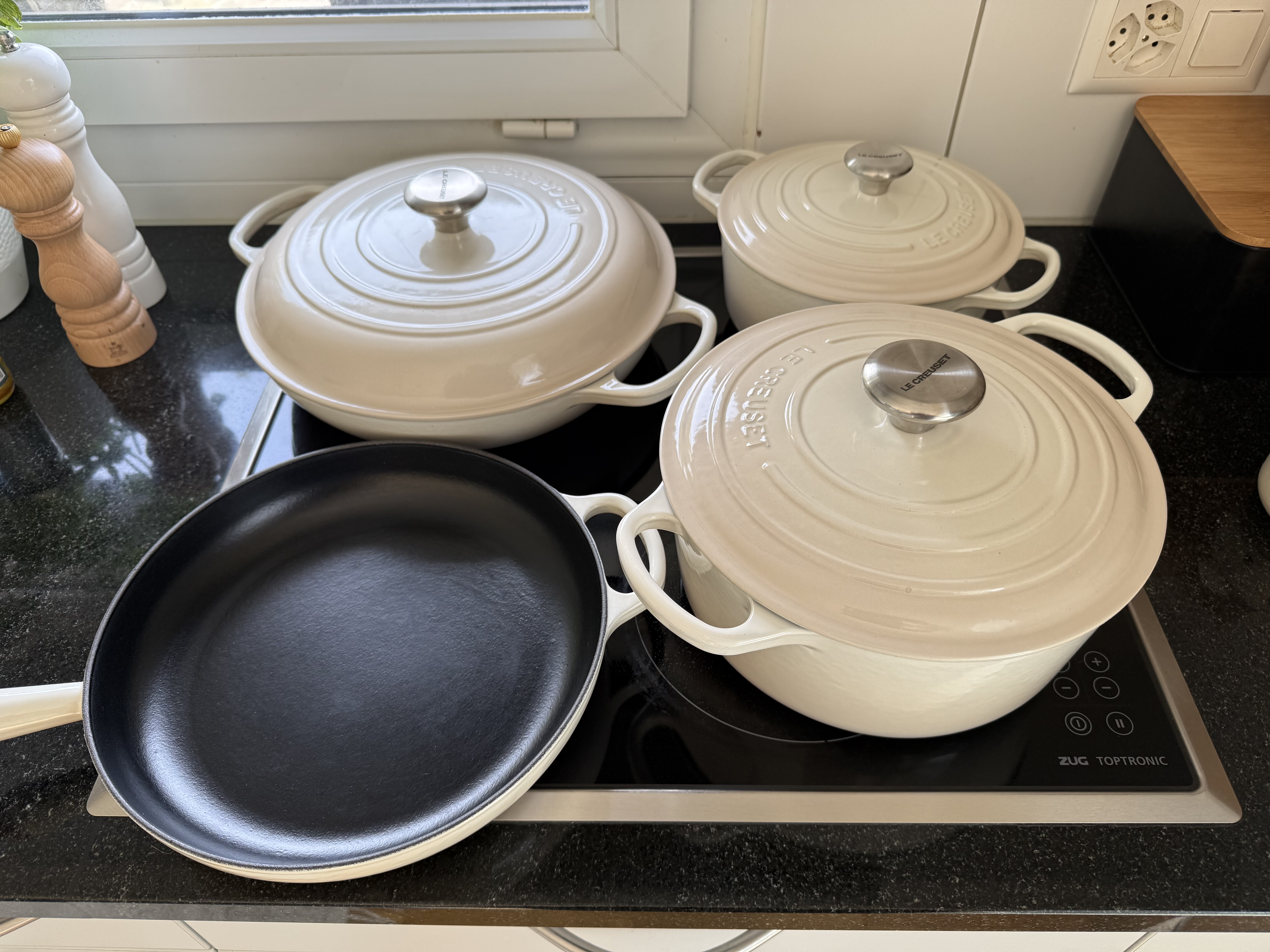 So farblich mögen wir es doch nicht, also ist unser Liebling der Farbton "Meringue". Und der Bräter mit 30cm Öffnung wird bei uns für fast Alles verwendet: