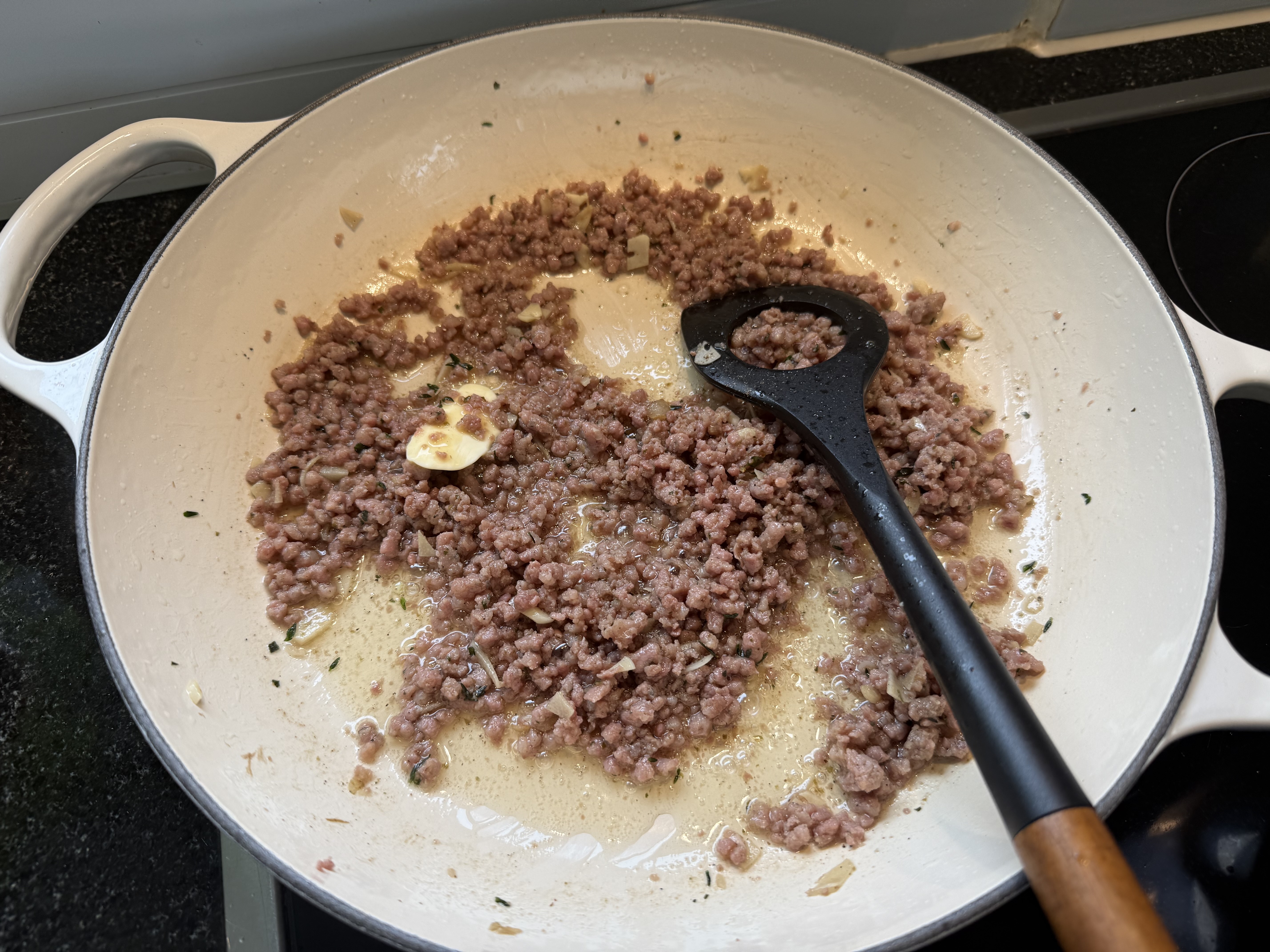 Die Salsiccia entferne ich aus dem Darm und lasse sie durch den Fleischwolf, damit eine feine, körnige Masse entsteht.