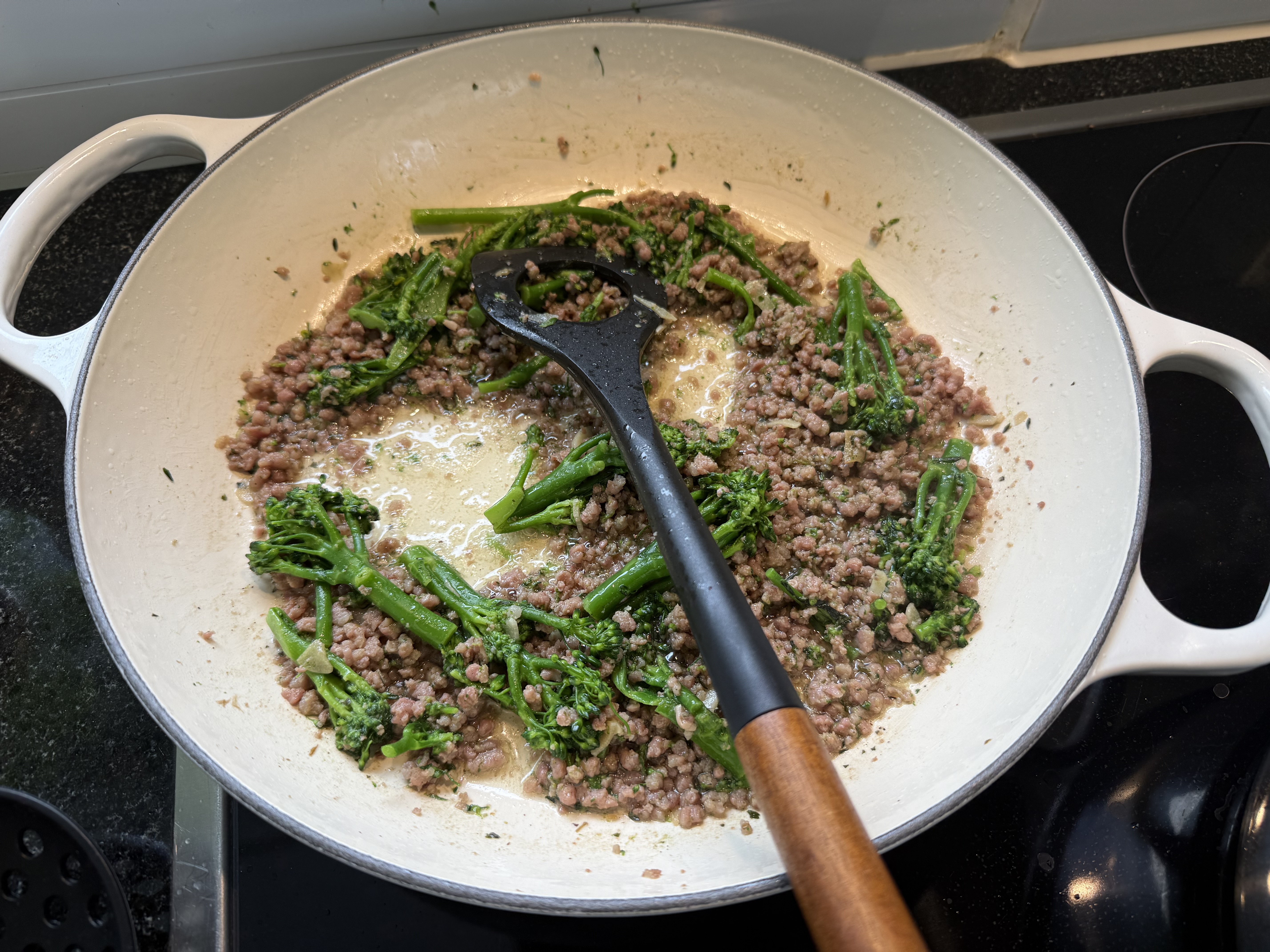 Zur gleichen Zeit schon einmal einen Topf mit Wasser und Salz zum Kochen bringen lassen. Sobald das Wasser kocht, den Broccoli für etwa 5 Minuten kochen lassen und dann in den Bräter mit dem Salsiccia geben.